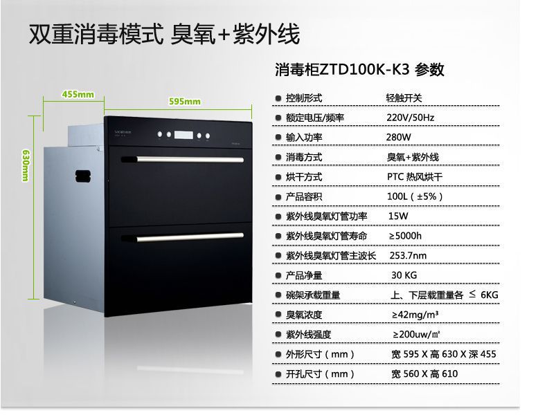 Sacon/帅康 ZTD100K-K3 紫外线臭氧杀菌消毒柜嵌入式碗柜热风烘干