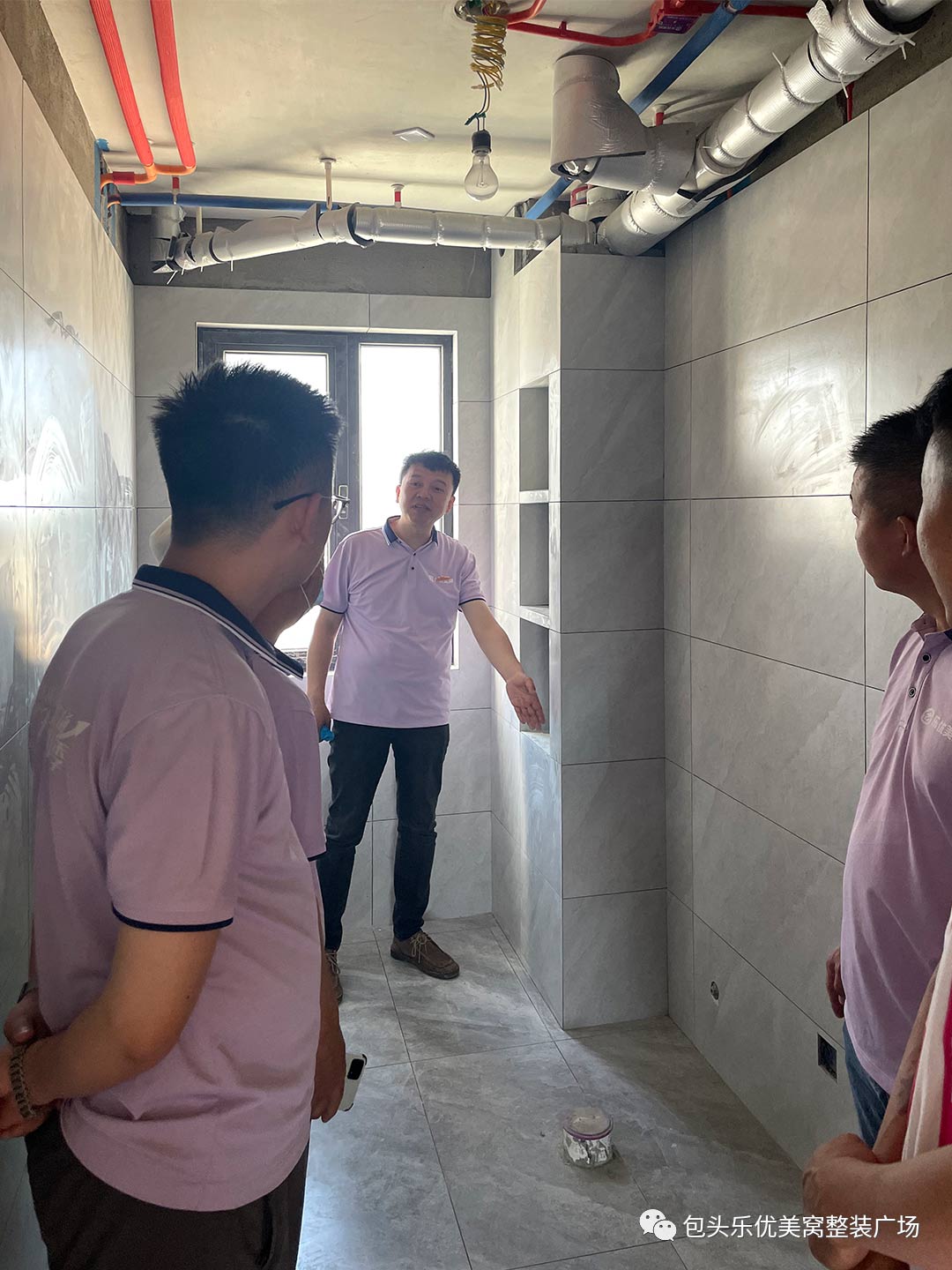 水电线管布局走向安全合理,石油有限管用排卡固定。 工地跟踪 远洲大都汇 • 瓦工阶段 巡检小组现场与瓦工师傅探讨瓷砖铺贴工艺,不断精进手艺,提高工地品质。