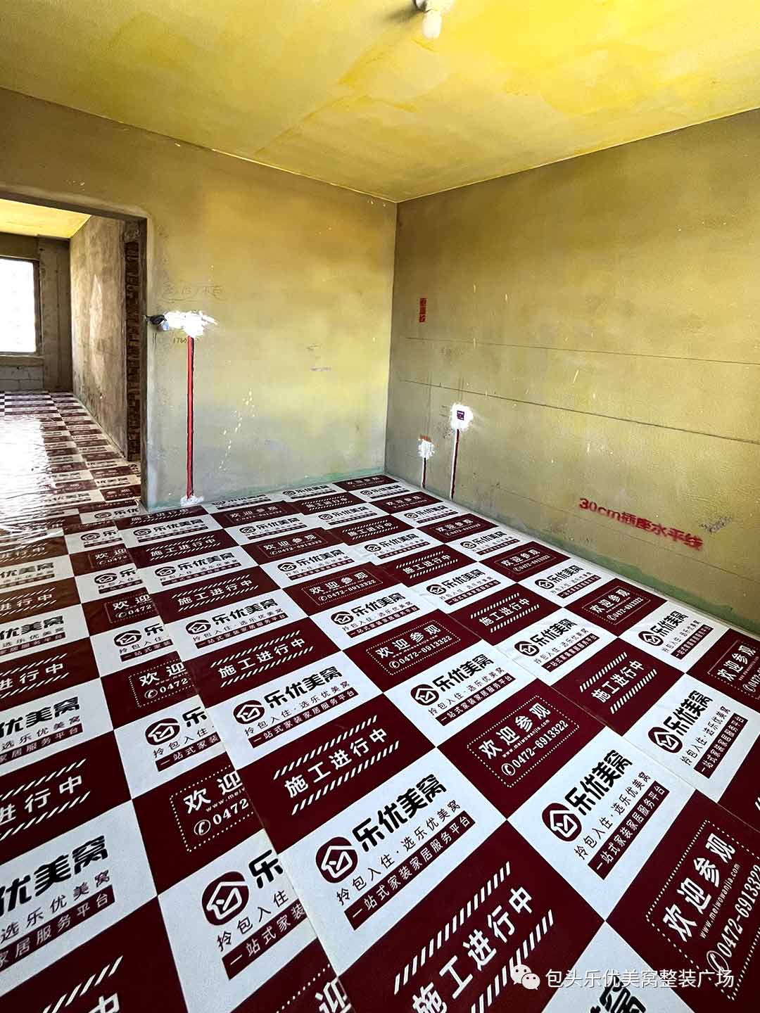 施工前的文明施工保护是乐优美窝高度重视的一环。走廊和墙面上的成品保护,保护地面在硬物重压下依旧光洁如新;门柱上的软包,将搬运工程中刮蹭磕碰的损坏降至最低。
