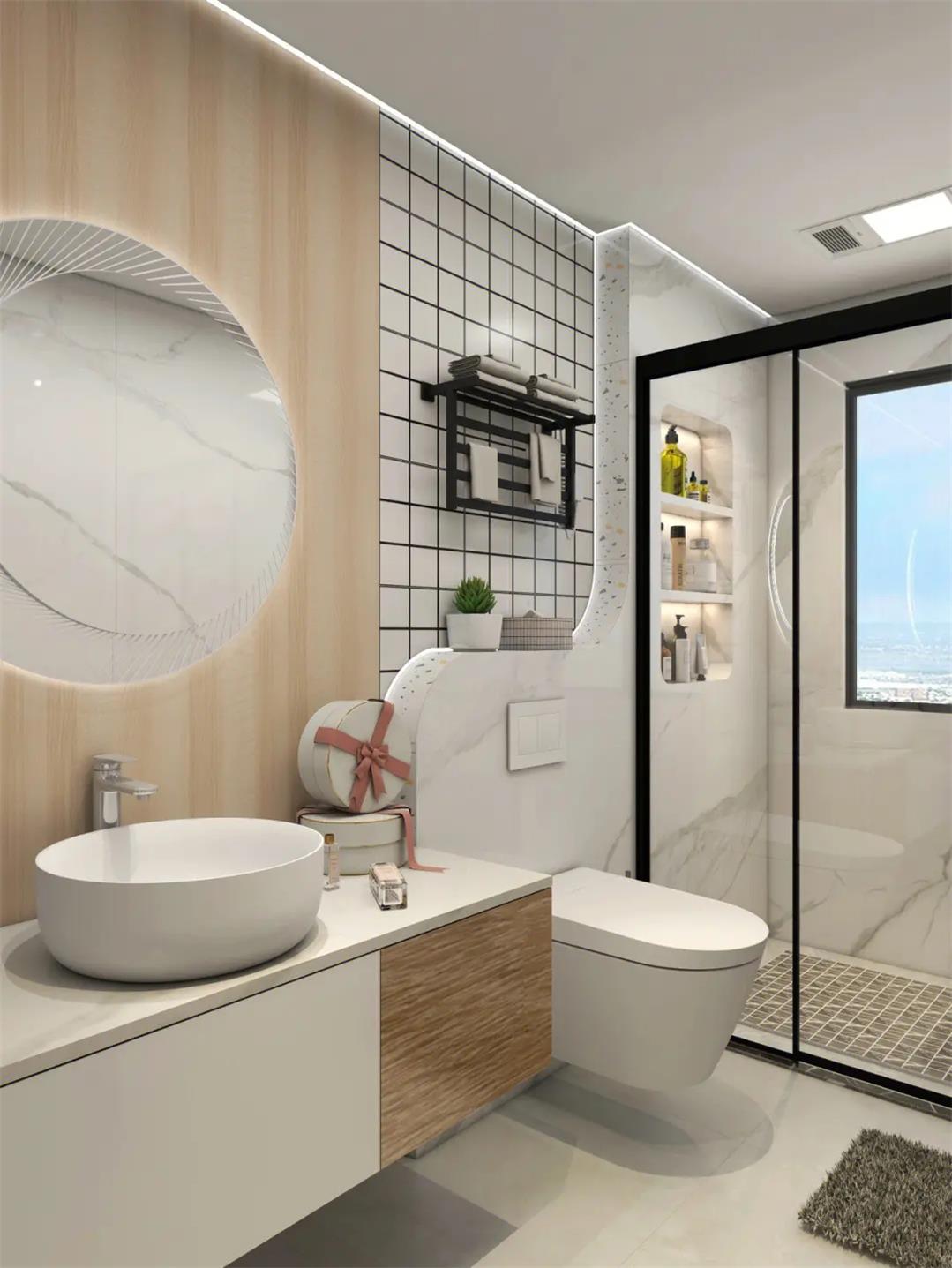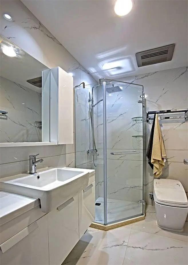空间若比较方正,建议选择悬挂洗面盆和马桶,不但有基本使用功能,还增大了使用面积。