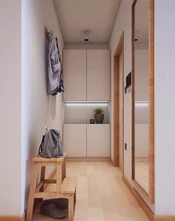 改造后:原来鞋柜处改为两个定制的白色橱柜,满足日常的收纳,中间留出空间可以放置杂物和其他装饰;为了改善采光问题,采用白色墙面和明亮的灯光;地板、门框、镜框和凳子都采用原木色木质材料,看着十分舒适。