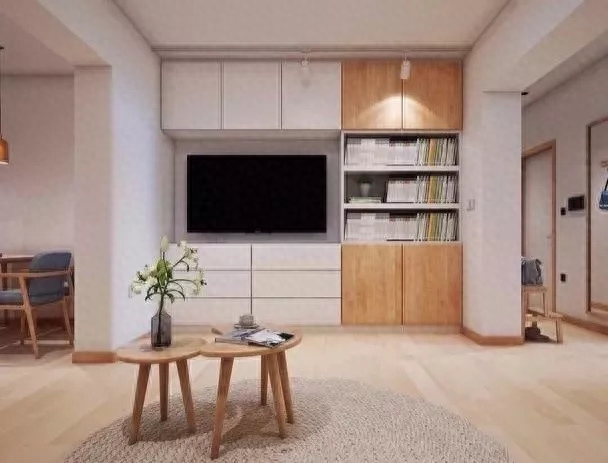 改造后:打通客厅和餐厅的隔墙,电视背景墙位置安装定制的橱柜,满足收纳;顶部添加射灯,增加照明
