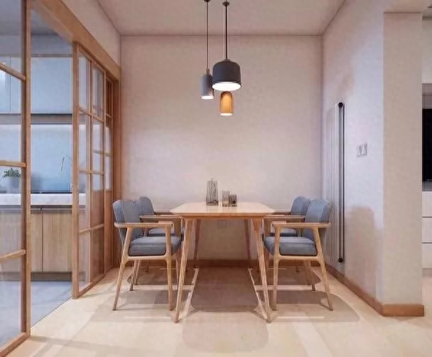 改造后,餐厅的空间还是蛮大的,一张长腿餐桌,4张简单的椅子,再搭配3个简洁的吊灯,看着十分自然。厨房安装了木框滑动玻璃门,节省空间