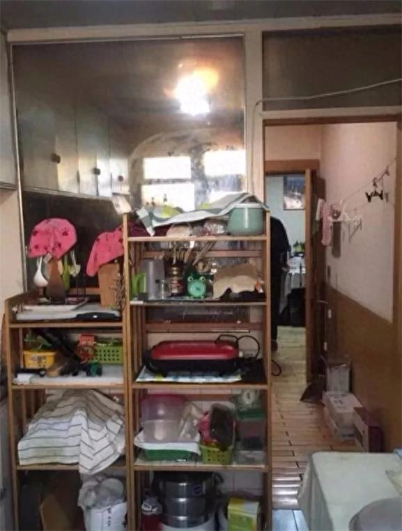 厨房的电器和用品将两个置物架全部填满,没有一点空余的地方,取用也不方便