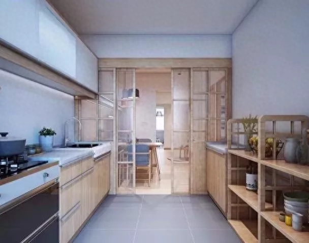 厨房另一边放置开放式置物架,整体风格统一,放置一些瓶瓶罐罐,也很美观