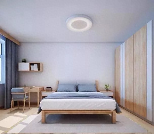 改造后:卧室采用统一的灰白、木质色调,床还是保留了原来的位置,床头放置一把桌子和椅子,方便临时阅读和办公