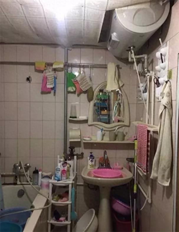 改造前:卫生间更为杂乱,墙砖上还有遗留的卡通贴纸,角落一个高高的储物架堆得满满的卫浴用品,视觉上看上去特别不舒服